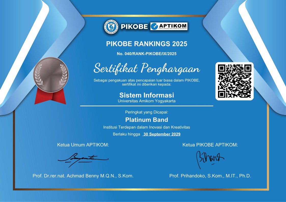 Program Studi Sistem Informasi Universitas AMIKOM Yogyakarta telah meraih penghargaan tertinggi, yaitu Peringkat Platinum, dari Pusat Indeks Kematangan Outcome-Based Education (PIKOBE) APTIKOM. Pengakuan bergengsi ini diumumkan pada Rapat Koordinasi Nasional APTIKOM 2025 di Bandar Lampung, 9–11 Oktober 2025.